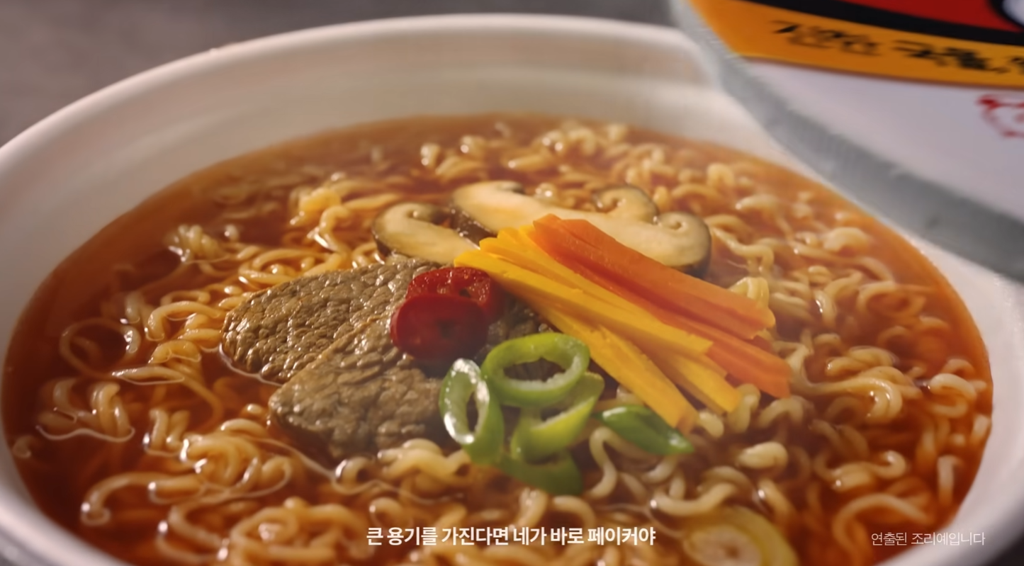 | 3~8초 | 거대한 라면과 인물의 대조, 인물이 앞으로 빠르게 달려나오면서 라면을 집는 연출. 인물이 카메라를 바라봄/뚜껑을 내려놓으며 쿵하는 효과음. |
