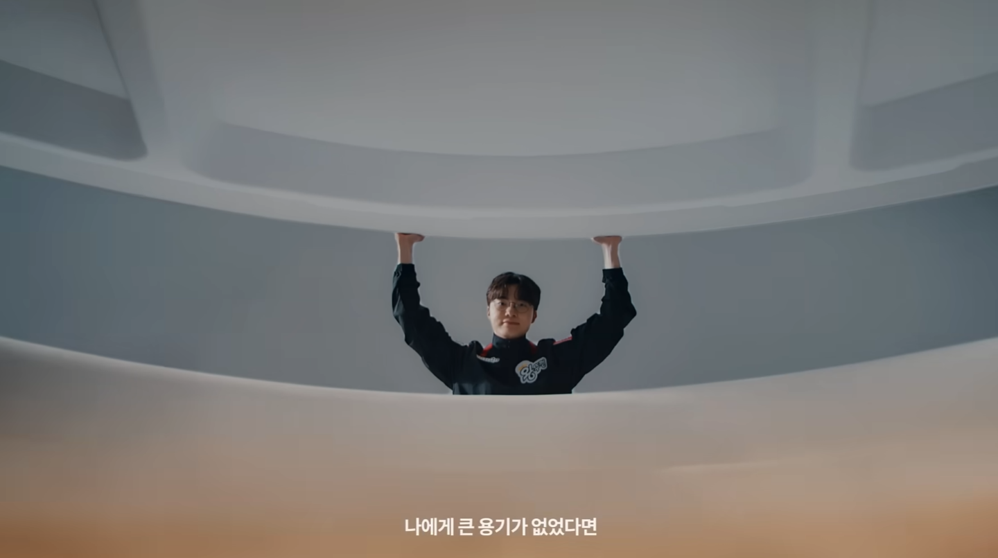 위치/움직임: 화면을 가리고 있던 뚜껑의 움직임이 시선을 끌어올림. 인물(페이커)이 중앙에 등장하며 시선이 고정되고, 내레이션으로 청각적 집중이 시작. |